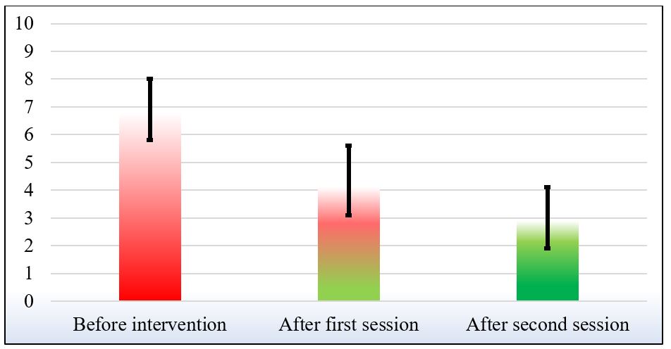 There was an improvement in the pain as assessed by the VAS score after the first session (P-value= 0.003) and after the second session compared to the first session (P-value= 0.004, respectively) as shown in table III and figure 1.